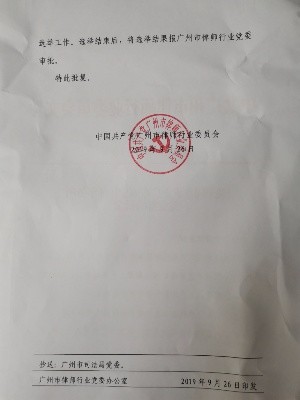 2019年9月26日中国共产党广州市律师行业委员会同意成立广东固信律师事务所党支部。